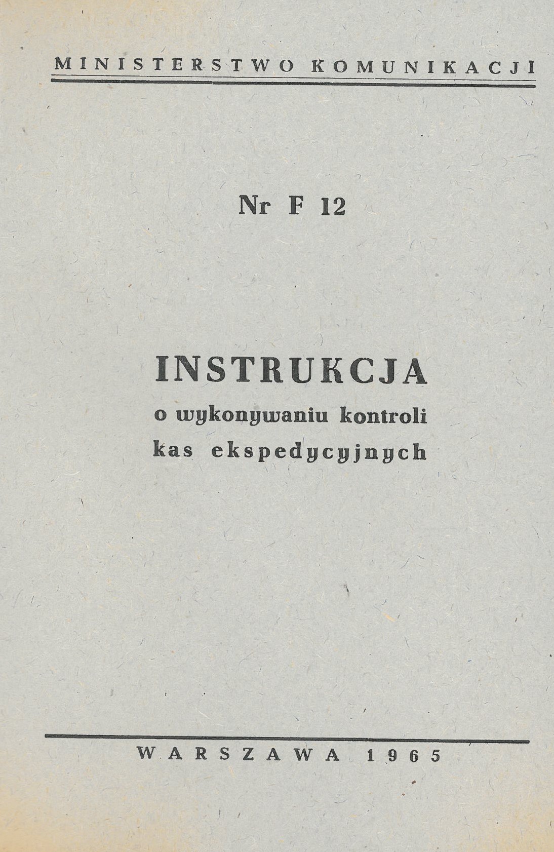 Instrukcja o wykonywaniu kontroli kas spedycyjnych : F 12 / Ministerstwo Komunikacji. - Warszawa : WDK, 1965. - 79 stron : tabele ; 15 cm, załączniki